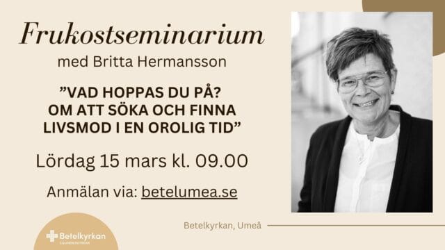Lördagen den 15 mars kl. 09.00 är du välkommen till ett intressant frukostseminarium med Britta Hermansson. Vi dukar fram en trevlig frukost, äter och umgås och lyssnar till Britta när hon talar utifrån temat: "Vad hoppas du på? Om att söka och finna livsmod i en orolig tid"   Vi är tacksamma om...