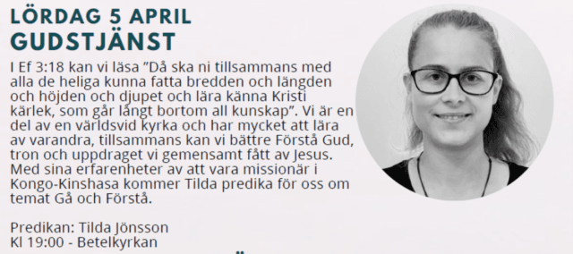 Välkommen till Gudstjänst lördag den 5 april 2025 kl. 19.00. Denna helg har vi besök av unga och äldre från hela landet inom ramen för "Möte: Mission". Tilda Jönsson som nyligen kommit hem efter tre år som missionär i Kongo-Kinshasa predikar och delar erfarenheter från sin tid där. Tema: ”Gå och...
